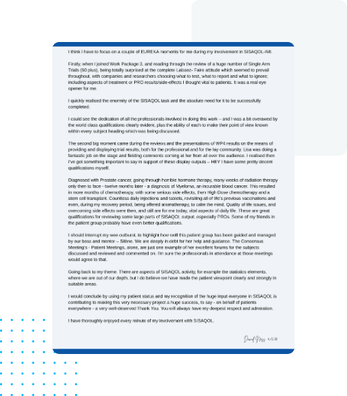 We share David’s words here to inspire and encourage other patient representatives to get involved in initiatives like SISAQOL-IMI. Your voice matters, and together, we can make a real difference.